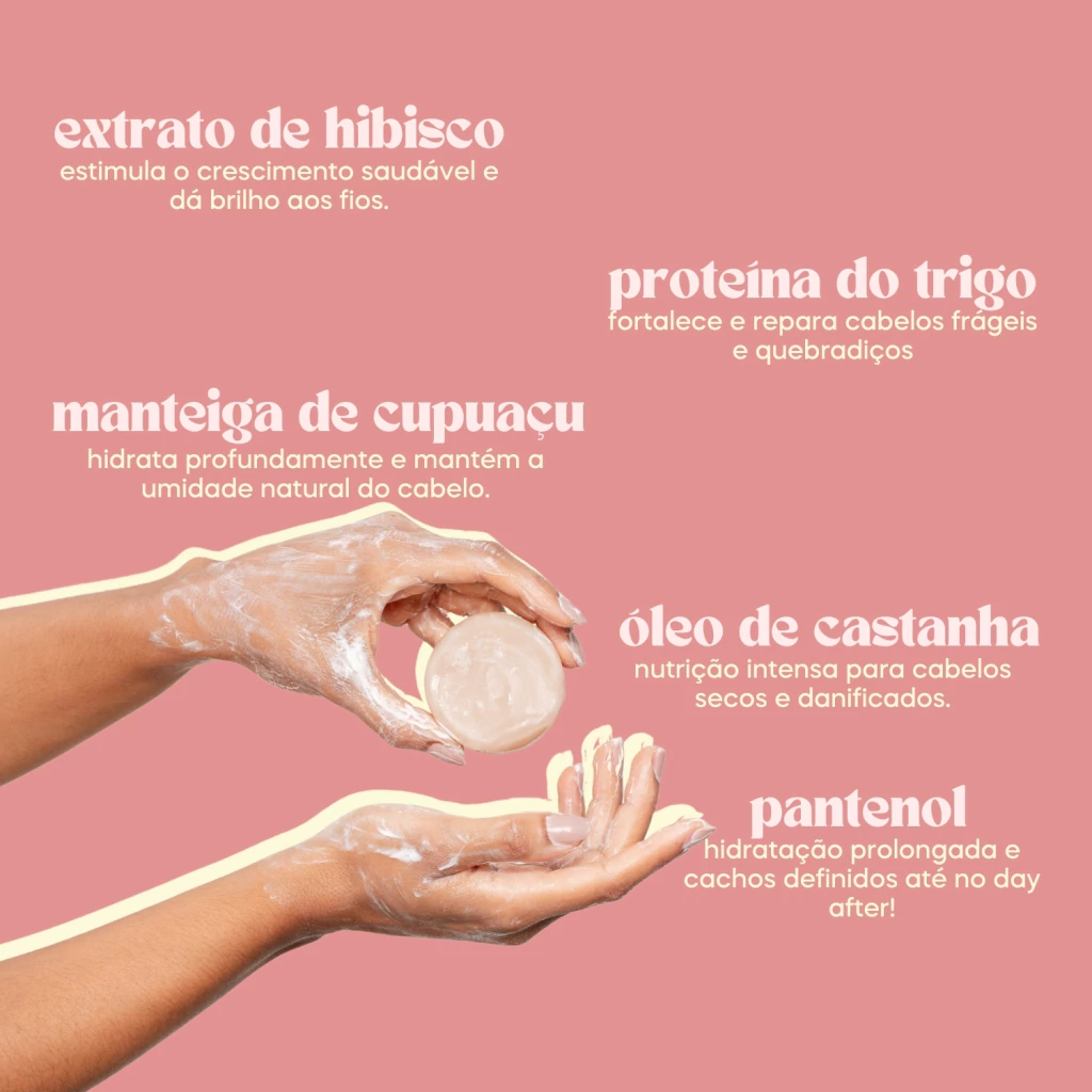 composição: Cetyl Alcohol (Álcool Cetílico), Cetearyl Alcohol (Álcool Cetoestearílico), Behentrimonium Methosulfate (Metossulfato de Behentrimônio), Theobroma Grandiflorum Seed Butter (Manteiga da Semente de Cupuaçu), Butyrospermum Parkii Butter (Manteiga de Karité), Bertholletia Excelsa Seed Oil (Óleo de Semente de Castanha do Pará), Pentaclethra Macroloba Seed Oil (Óleo de Semente de Pracaxi), Hydrolyzed Wheat Protein (Proteína Hidrolisada de Trigo), Hibiscus Sabdaria Flower Extract (Extrato da Flor de Hibisco), Parfum (Fragrância), Benzyl Alcohol (Álcool Benzílico) Panthenol (Pantenol), Rosmarinus Ocinalis Leaf Extract (Extrato da Folha de Alecrim), Dehydroacetic Acid (Ácido Dehidroacético), Aqua (Água), Limonene (Limoneno)