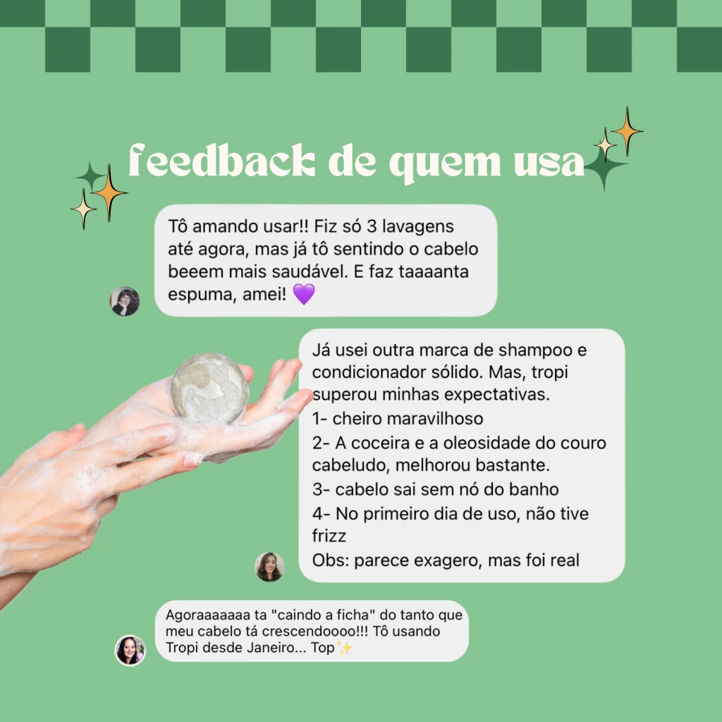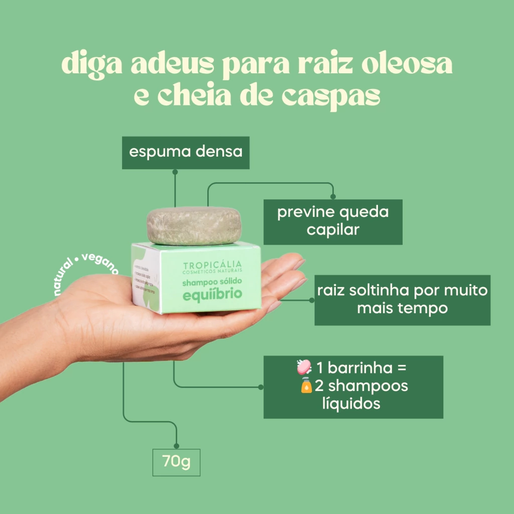 se você sente que seu cabelo fica oleoso rapidamente e sofre com caspas ou dermatite seborreica, o shampoo sólido equilíbrio da Tropi é a solução ideal! Com uma limpeza eficaz, ele controla a oleosidade sem efeito rebote, deixando os fios soltinhos e saudáveis por mais tempo.