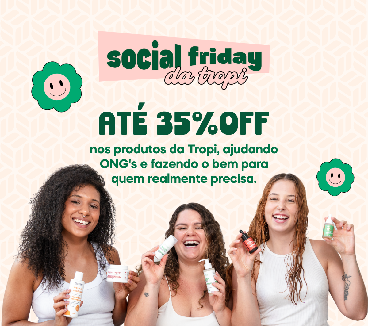 na Tropi Social Friday você ganha desconto para montar a sua rotina com produtos naturais e sustentáveis e fazendo uma doação de no mínimo R$5 para uma das instituições de caridade parceiras, você ganha mais 10% OFF